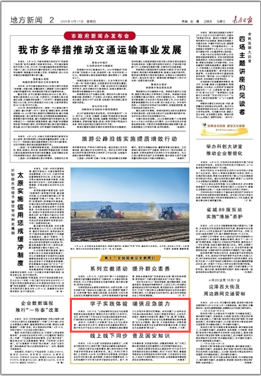 4月17日,《太原日报》第2版以《学子实践体验 增强应急能力》为题对永利官网举办的大学生安全与应急实践体验系列活动进行报道。现将全文转载如下。