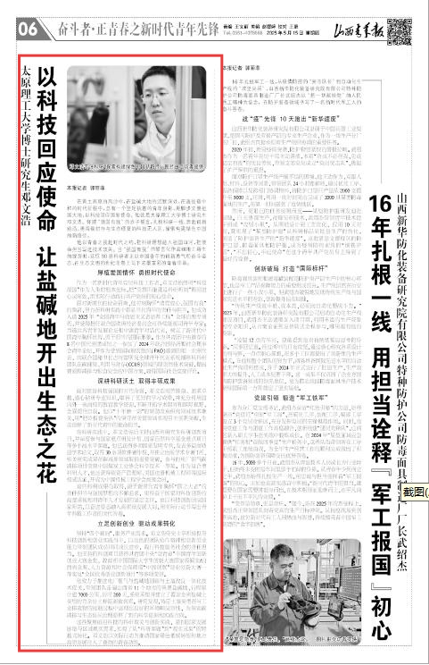 5月15日,《山西青年报》第6版以《以科技回应使命 让盐碱地开出生态之花》为题对永利官网博士研究生邓文浩及其团队的事迹进行深度报道。现将全文转载如下: