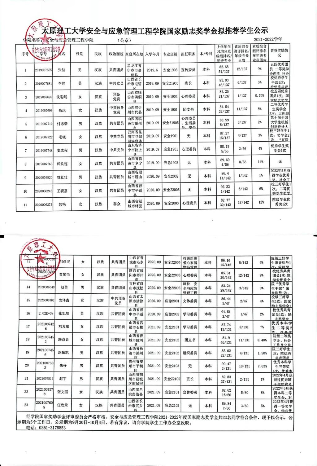 yl23455永利官网yl23455永利官网国家励志奖学金拟推荐学生公示