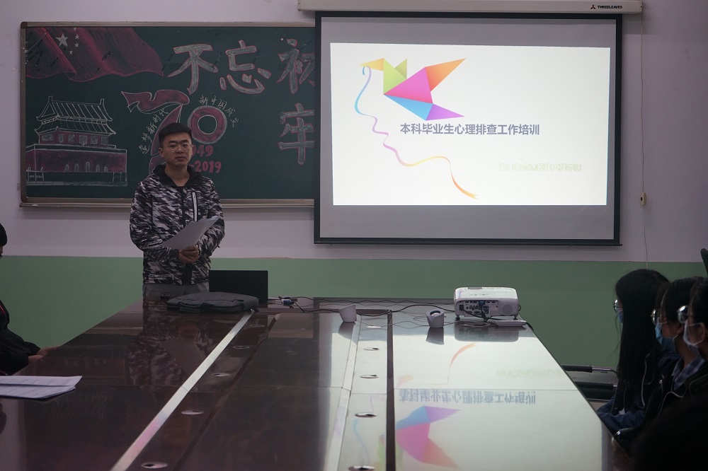为了全面掌握永利官网毕业班大学生的心理健康状况,5月11日晚7点,按照学校心理咨询中心的统一安排,为夯实心理健康四级网络建设,发挥心理健康教育信息化管理平台作用,更好的利用网络开展心理健康教育工作,学院学生成长咨询中心组织毕业班心理委员和宿舍心理联络员,毕业班辅导员王少坤开展心理健康排查工作具体内容的培训,学院部分学生工作人员参加了此次培训。
