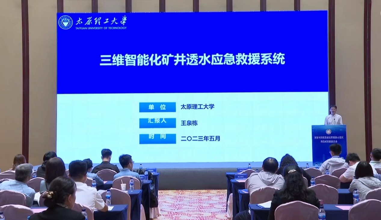 国家可持续发展议程创新示范区科技成果路演活动于5月31日在太原市山西国际会议中心举行。永利官网本科生科创团队(指导老师:谢彪,团队成员:王泉栋、雷倩茹、刘雨豪等)参加此次路演活动,并于路演会场进行项目成果展示。此次展示项目为三维智能化矿井透水应急救援系统,该项目在2022年大学生创新创业训练计划项目中立项,以团队成员为主要完成人申请了发明专利5项,已成功授权3项,另获软件著作权2项,此前在第十八届“挑战杯”山西省大学生课外学术科技作品竞赛中获全省一等奖。