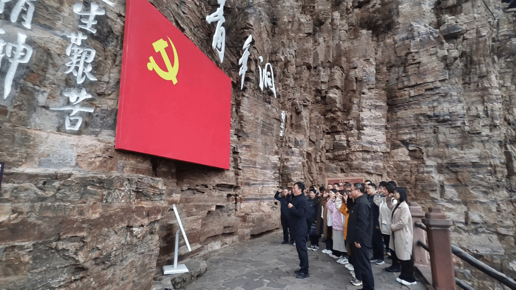 习近平总书记指出,愚公移山精神、焦裕禄精神、红旗渠精神,这些革命创业精神是我们党的性质和宗旨的集中体现,历久弥新,永远不会过时。在红旗渠纪念馆,全体党员认真聆听红旗渠建设过程中的感人故事,观看珍藏照片和历史遗物,实地参观引水渠,全面了解红旗渠的由来和建造全过程,深刻感受林州人民在太行山悬崖峭壁上开凿生命之渠的艰难历程,亲身感悟“自力更生、艰苦创业、团结协作、无私奉献”的红旗渠精神。在红旗渠咽喉工程青年洞,巍巍太行山上一面鲜红的党旗格外醒目,全体党员在此重温入党誓词,誓言字字铿锵有力,句句掷地有声。
