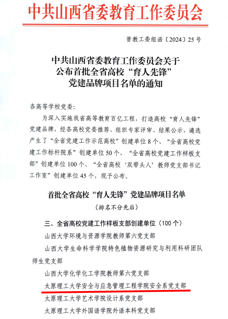 近日,省委教育工委公布首批全省高校“育人先锋”党建品牌项目,yl23455永利官网安全系党支部入选“全省高校党建工作样板支部创建单位”。